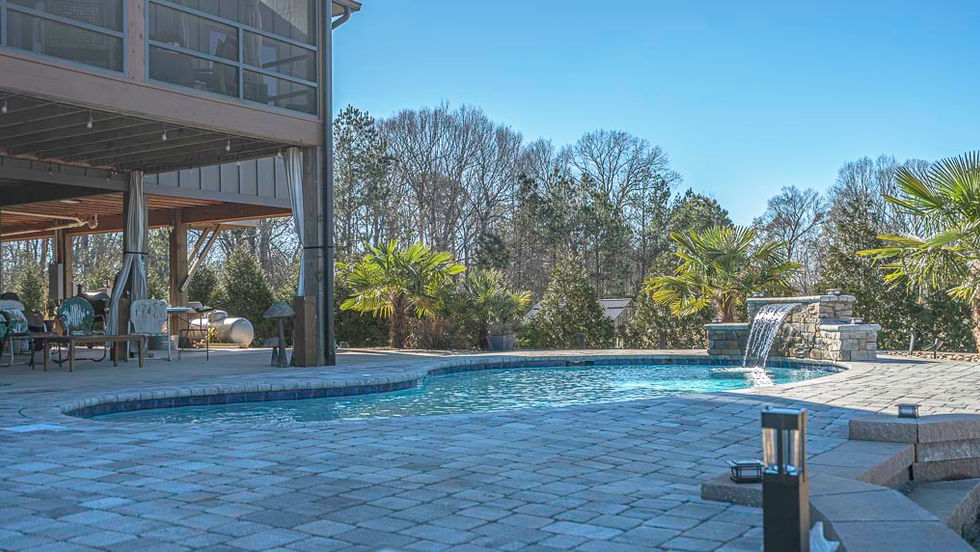 Stunning kidney shaped gunite pool with a cascading waterfall and elegant cobblestone pavers.